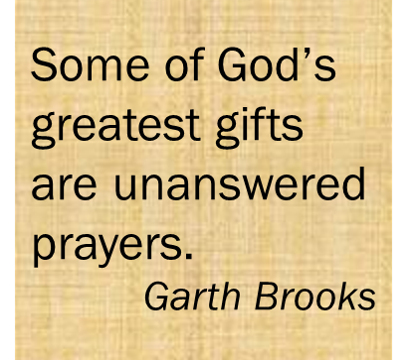 One of my favorite Garth songs is Unanswered Prayers (click on the song title if you want to hear it). The lyrics tell the story of a man who takes his wife to a football game at his old high school. They stop to talk to a woman he had dated back in the day. He remembers how he had prayed for things to work out for them, but his prayer wasn’t answered. Later, he understood the genuine blessing when God brought him the true woman of his dreams.