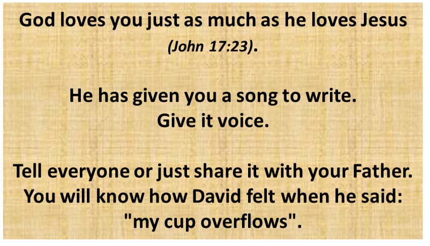 It is difficult to admit my weakness but more amazing that God loves me anyway. When I mix David’s elements with my images, my song pours out the same way that his must have.